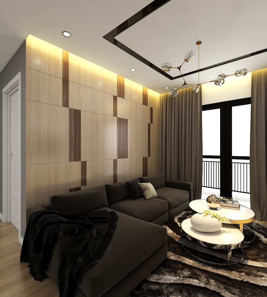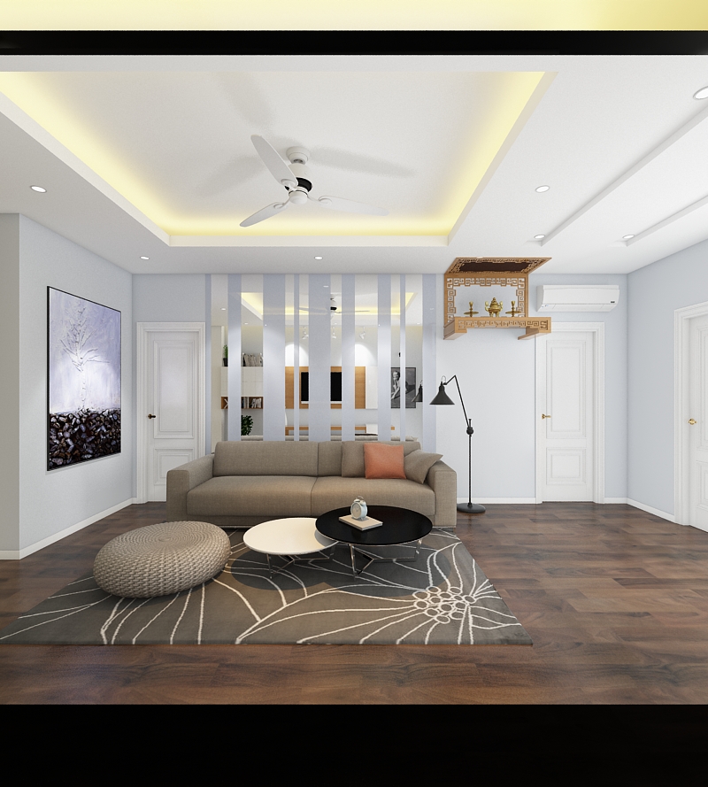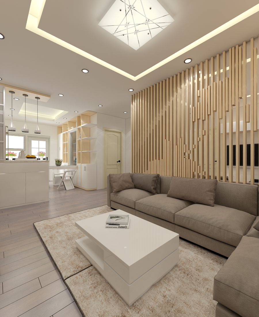 Thiết kế nội thất phòng khách hiện đại, đơn giản nhưng tinh tế. Bộ sofa và bàn trà đều được tạo nên bởi các chi tiết thiết kế đơn giản mang lại sự thông thoáng và rộng rãi cho không gian sinh hoạt chung của gia đình. Bộ sofa màu xám luôn được ưa chuộng bởi màu sắc sang trọng, bền bỉ với thời gian. Vách ngăn phòng khách sử dụng màu gỗ vàng sáng tạo cảm giác cơi nới không gian nội thất.
