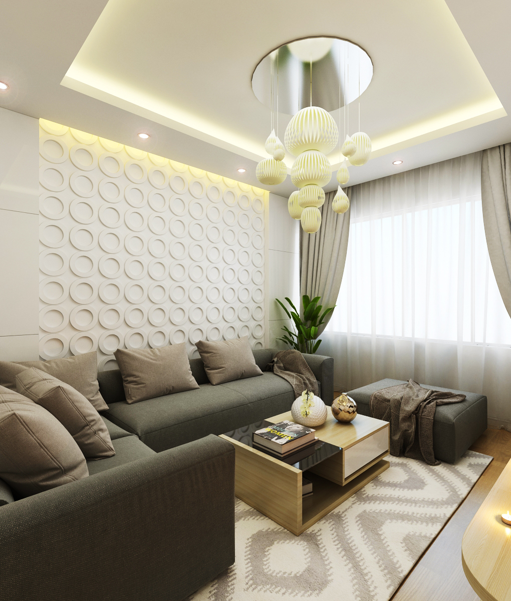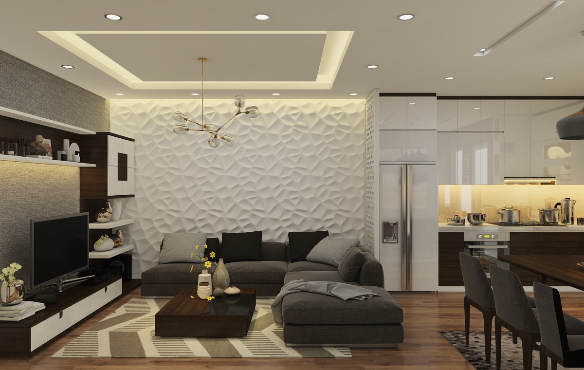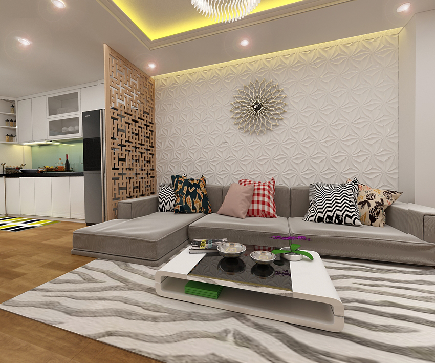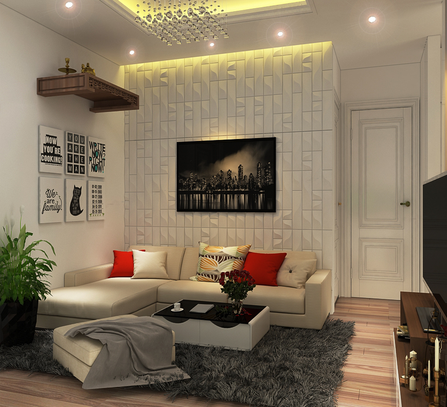 Mẫu 2: Thiết kế nội thất phòng khách chung cư luôn được chú trọng bởi nó là không gian trung tâm của ngôi nhà. Không chỉ là nơi tiếp khách mà còn là không gian sinh hoạt chung của gia đình, góp phần gắn kết các thành viên trong gia đình. Nội thất phòng khách sử dụng màu trắng chủ đạo với trần, tường và vách ốp 3D mang lại điểm nhấn cho không gian phòng khách. Các bức tranh treo tường tăng phần sinh sộng cho nội thất.