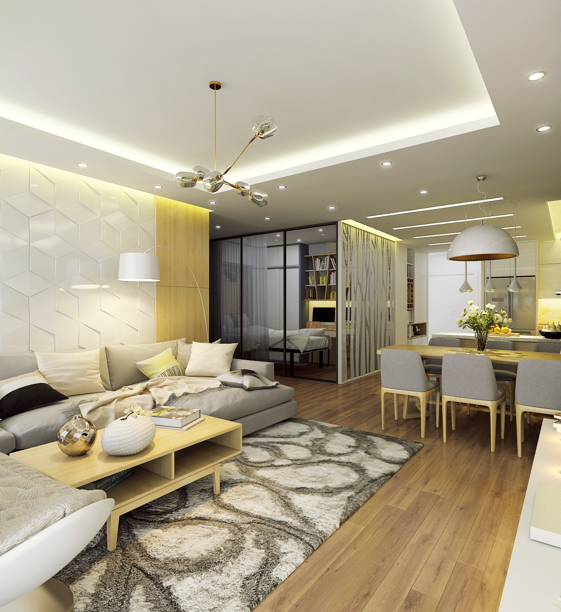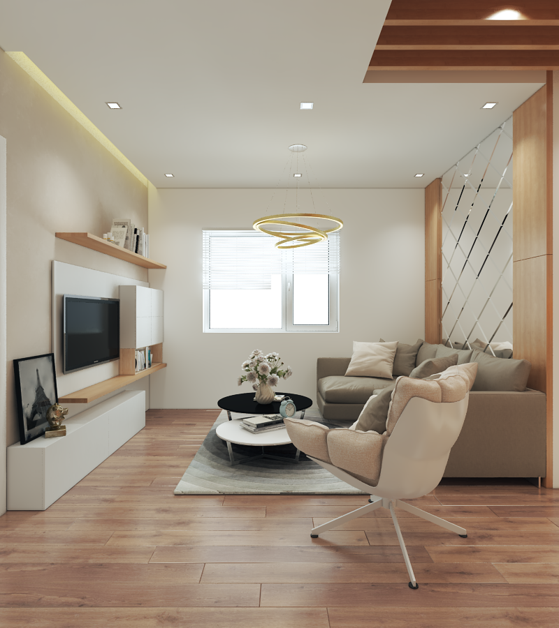 Mẫu 8: Thiết kế nội thất phòng khách liền kề với nội thất phòng ăn tạo ra sự liền mạch, gắn kết các không gian chức năng. V-home lựa chọn phong cách thiết kế không gian mở để tối ưu không gian, mang lại sự thông thoáng, rộng rãi nhất. Màu trắng và màu gỗ vàng sáng là kiệt tác nghệ thuật trong thi công nội thất chung cư.